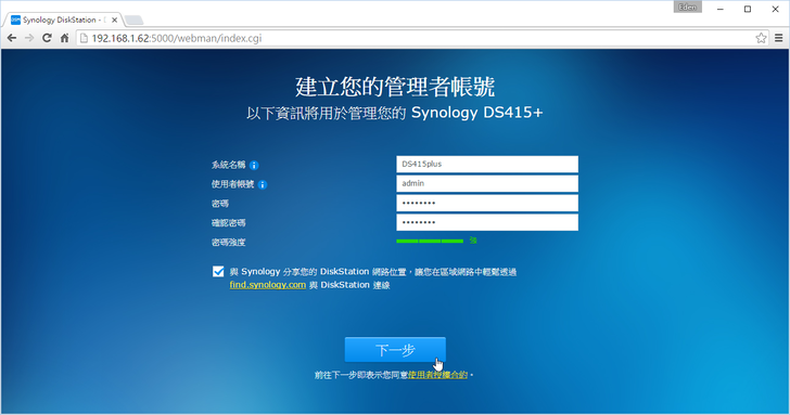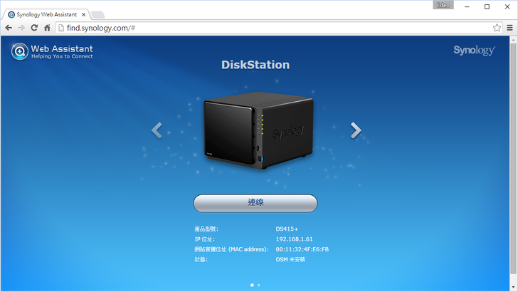 將DS415+和電腦連接至同一個區域網路下,此時開啟瀏覽器輸入http://find.synology.com,即可打開NAS的設定畫面。