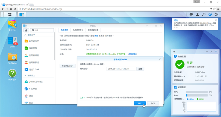 下載好後,於控制台 → 更新&還原 就可以手動上傳更新DSM(注意升級後可是不能降級的喔!)。