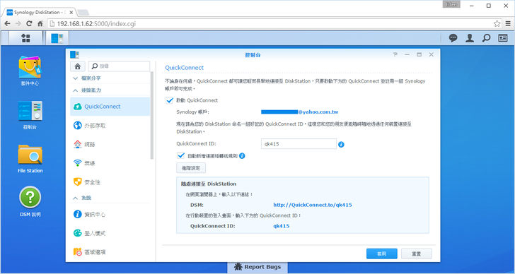 不過任何一個功能點進去後,其實左側的功能表都是一樣的。下圖為QuickConnect ID的設定畫面,如果要改ID的,這邊還可以隨時更改。