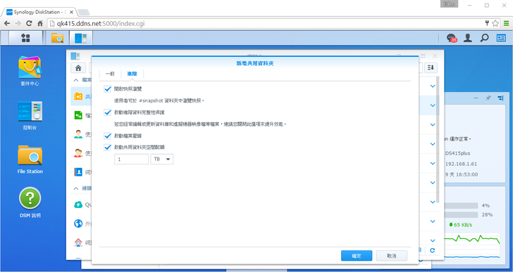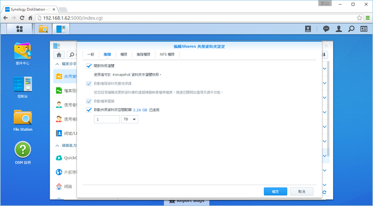 4. 共用資料夾空間配額:防止單一共享資料夾的空間占用太多,可設定的容量為MB、GB、TB。