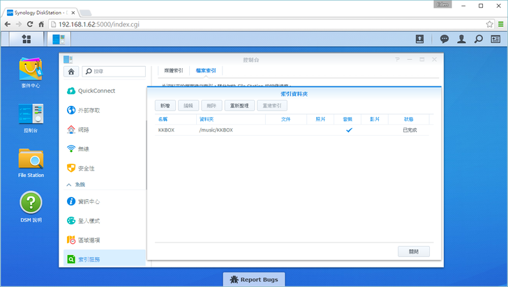 因此我們可以在設定 → 索引服務 → 檔案索引的地方將KKBOX的地方建立索引,讓搜尋的時候能搜尋文件內容、甚至是多媒體檔案的屬性資料。