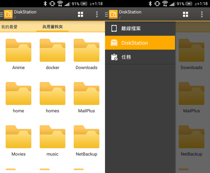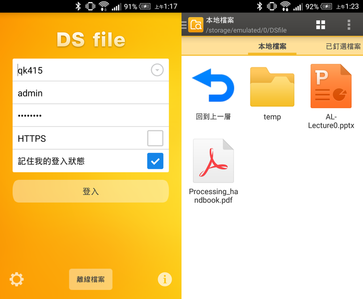 而File Station的app版 — 「DS file」,它和資料夾的顏色一樣,整個都是黃澄澄的介面;在"離線檔案"中,可以看到自行下載在手機內的檔案。