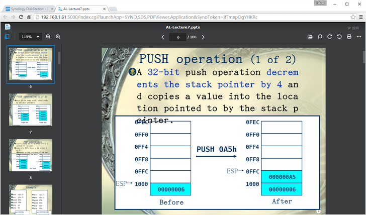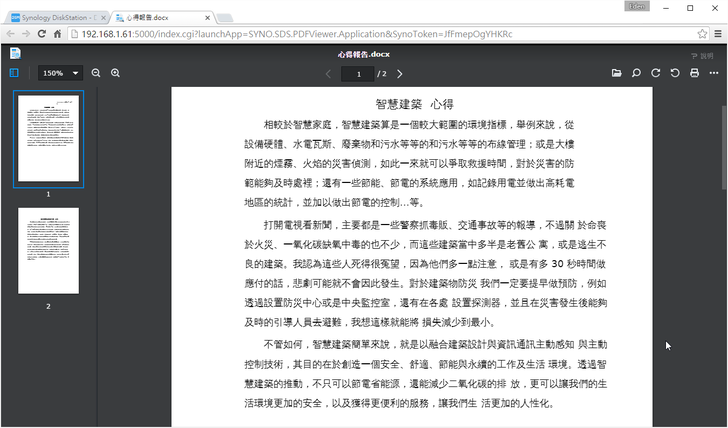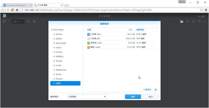 DSM也有線上文件檢視器的功能,如此一來,使用者不用為了每次要檢視文件還要特地下載下來。像筆者本人電腦內的Download資較夾就有一堆檔案,文件大約就佔了六成吧,而且本人也懶得整理...此外,電腦內沒有裝Offfce或是PDF Reader的,利用文件檢視器看文件就非常方便。如下圖,它支援Word, Powerpoint, Excel, pdf, txt等文件。