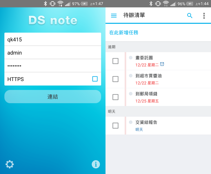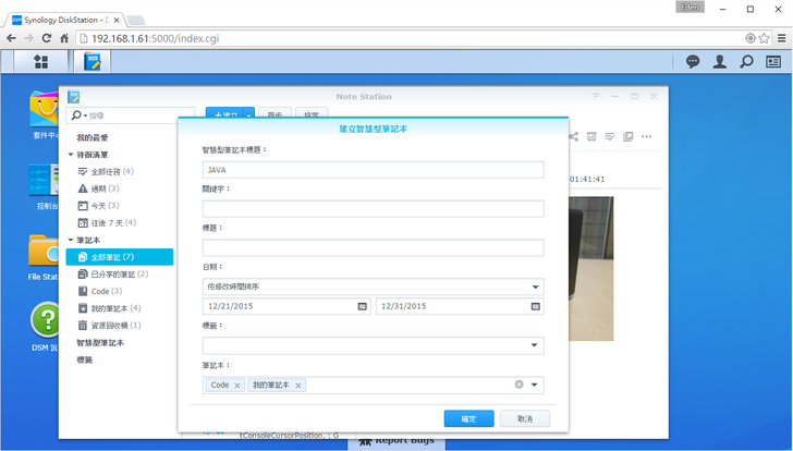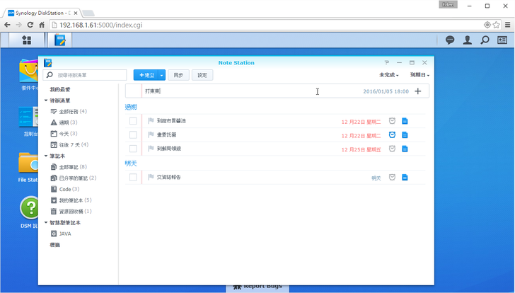 筆者認為在Synology裡,最實用的生產力工具就是Note Station了!!!如果善加利用這個套件,相信一定對生活更加便利~下圖看到的是代辦清單,只要在"按此新增任務"欄位打好要辦的事,並選好截止時間,甚至還可以選擇提醒的時間,非常簡單。