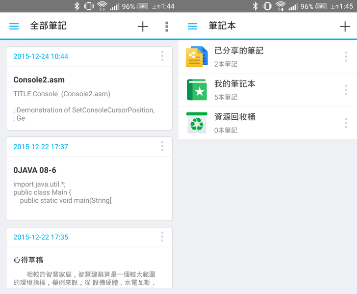 下圖是全部筆記和記事本頁面,筆記為一欄一欄的呈現方式,十分清楚。