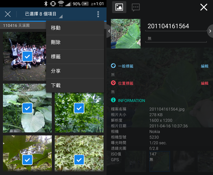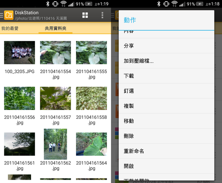 在圖片資料夾,利用縮圖的瀏覽方式就可以看到圖片的小圖;然後選擇一個檔案,有分享、下載、移動、刪除等等,不會因為是app功能就比較少。