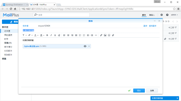 如果要將檔案轉寄給其他人,直接開啟"MailPlus",輸入寄件人、主旨和夾帶的檔案就好,所有事情在Synology就能包辦。