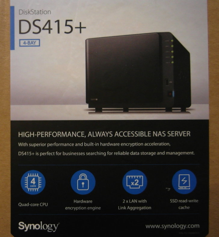 下方的貼紙寫出了DS415+的四大特色:四核心、硬體加密引擎(確保資料安全性)、2個網路孔(擁有通道聚合技術,可使傳輸具有負載平衡)、SSD 讀取/寫入快取。