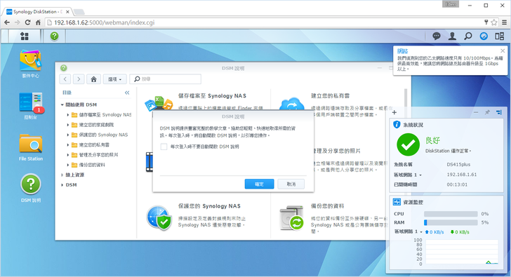 進入DSM的畫面,有沒有覺得畫面很豐富呀XD!!而每次登入會顯示"DSM說明"(可以取消勾選),其實Synology要告訴你的就是有任何疑問可以先到"DSM說明"找找,裡頭一定有相關教學介紹的!