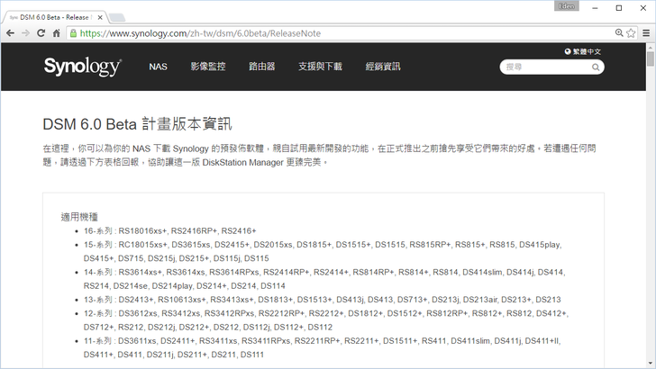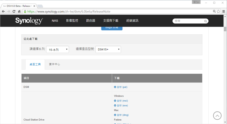 頁面向下滑,選擇好NAS的機型就可以進行DSM 6.0 Beta 的下載。