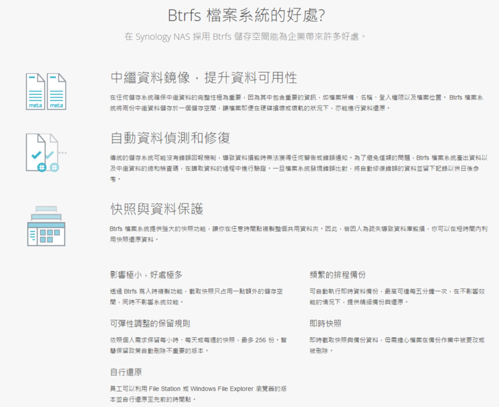 2.快照資料(可立即進行資料保護,類似還原點功能),以及資料的偵測和修復。
