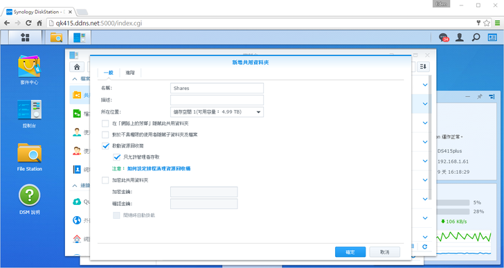成功建立後,就可以到設定 → 共用資料夾新增資料夾啦!點選"新增",新增一個共用資料夾;這裡建議將資源回收桶打開,以免發生資料誤刪的窘境。