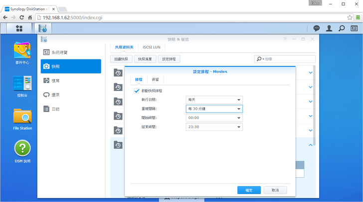 在快照的地方,可以設定快照的拍攝週期,當然時間是越短越好;不過筆者為了測試,設定為30分鐘一張快照,一般來說大約12小時或每日一張快照就算很多了。