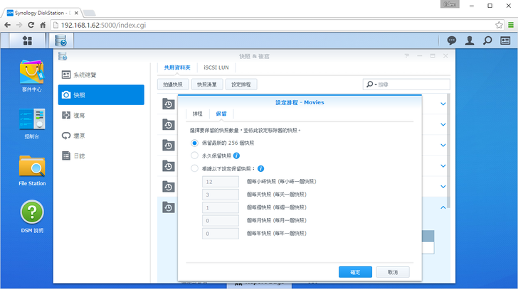 不過時間一久,快照一多也會浪費伺服器的空間;因此可以設定要保留最近多久的快照,如:12小時一張快照,然後保留最新的256張,這樣也能保存四個月以前的資料了呢!