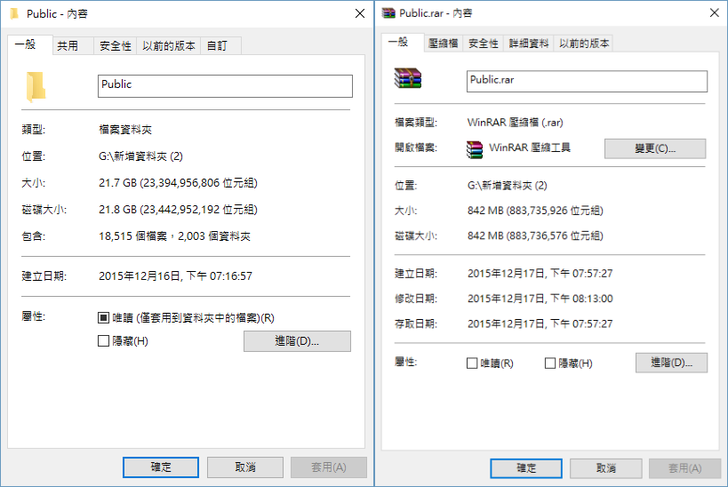以下將測試檔案壓縮的效果與功能,筆者先用電腦將Public檔案做未壓縮與壓縮後的比較,從下圖可知,未壓縮的檔案為21.7GB,而壓縮後則為842MB。