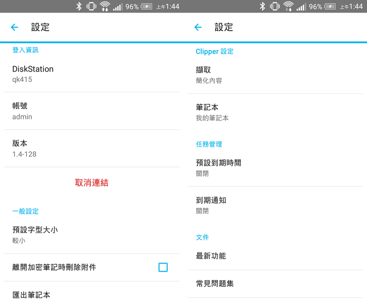 相關app設定在此。注意「DS note」登入後就會綁定手機(因此沒有登出鍵,而是"取消綁定")了,以利隨時能同步和通知。
