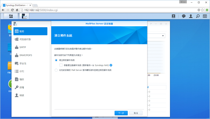 首先打開MailPlus Server,會自動跳出設定精靈,這裡請選擇"建立新的郵件系統"。