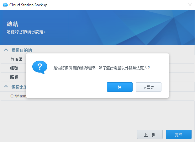 在按下完成之前,會詢問是否將備份目的設為"唯讀",建議選擇"好",以防電腦備份來源的資料被更動。