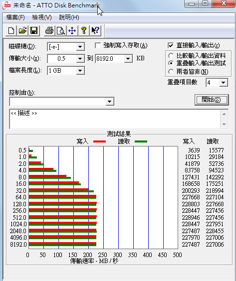 ▼在ATTO Benchmark軟體測試結果,在檔案長度32KB以上時,讀取跟寫入的效能就能達到228.4MB/s最佳表現。