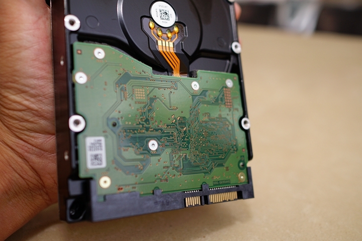 ▼HGST Deskstar NAS 6TB背面設計,可以看出所有的IC、電容,都設計在電路板背後,可以有效保護電路板因意外碰撞而受損。