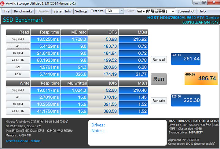 ▼在Anvil's Storage Utilities軟體測試下,檔案大小設定為1GB時,循序讀取速度為215.92MB/s、寫入速度為210.40MB/s、總分為486.74分。