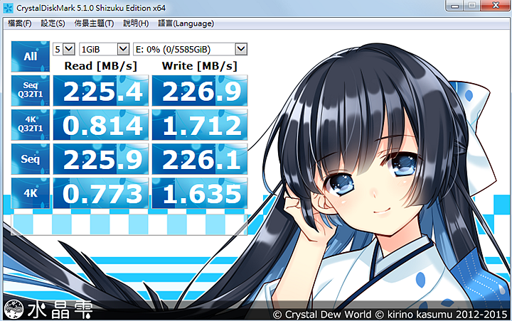 ▼在CrystalDiskMark 5.1軟體測試下,檔案大小設定為1GB時,循序讀取效能為225.4MB/s、循序寫入效能為226.9MB/s;4K讀取效能為225.9MB/s、4K寫入效能為226.1MB/s