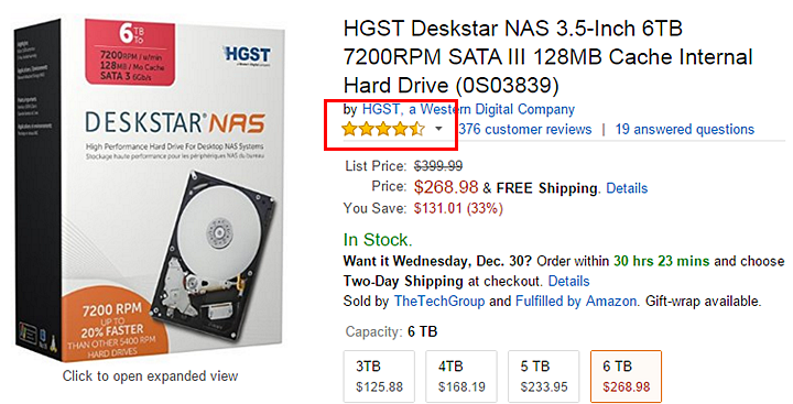 ▼HGST Deskstar NAS 6TB這顆硬碟在國際知名的AMAZON賣場,獲得4.5星(滿分五星)的使用者滿意推薦,用過的玩家留言幾乎一致好評。