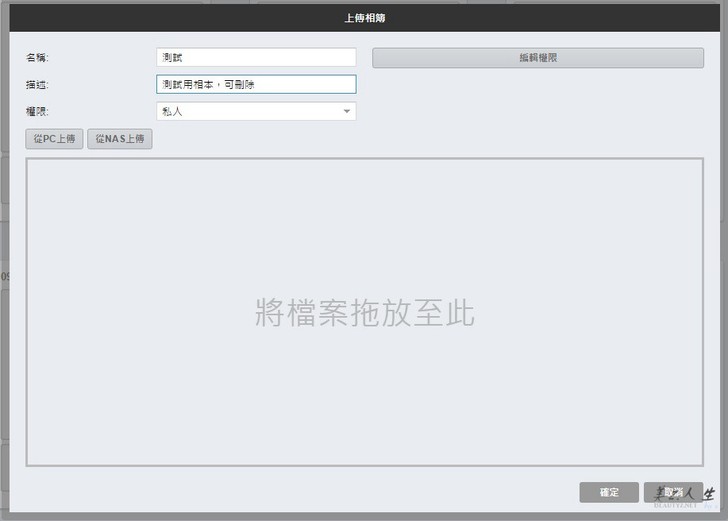 用拖放的方式把照片從檔案總管上拖曳上去,再按右下角的確定,即可完成照片檔案的上載