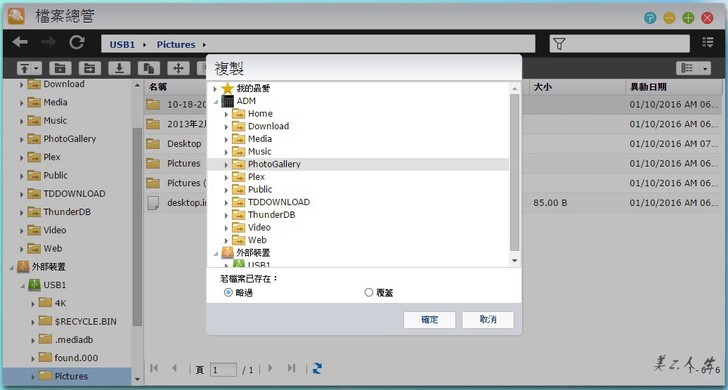 或者是用ASUSTOR的ADM,在檔案總管中,用複製的方法把照片從外接裝置複製到\PhotoGallery中,即可在Photo-Gallery APP中自行產生相本