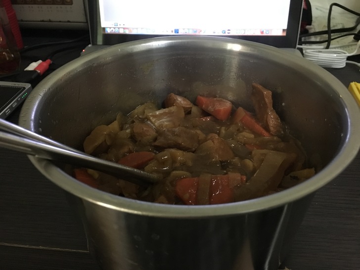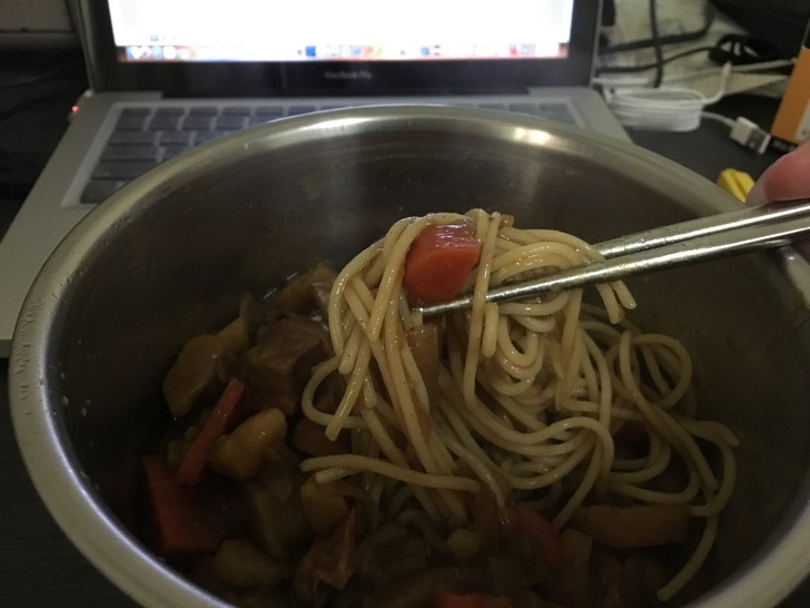 料理內容是咖喱義大利麵,之前就做過一整鍋的咖喱,剛好今天把它拿出來蒸一蒸,