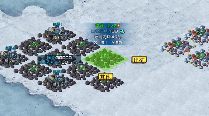5、聯合採礦:當您與盟友的部隊間隔排列時,將會共同開採被圍住的礦,被圍住的礦平分開採,兩支部隊可以開採3格礦(1.5倍效率)。四支部隊可以開採9格礦(2.25倍效率),多人聯合可以將每個部隊效率提高到最高四倍。