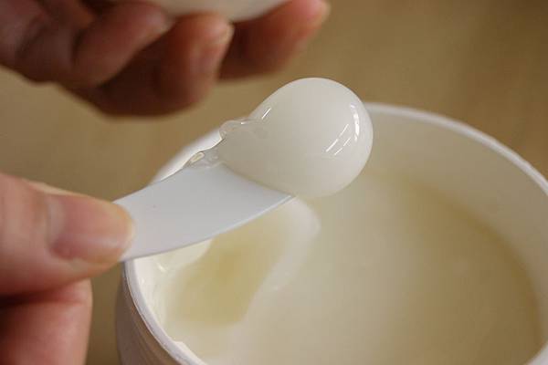 酒釀娘凍膜的質地非常的濃稠,輕輕挖一杓給大家看,是不是就像精華乳一樣,而且使用的方法非常簡單,只要在全部保養程序的最後,取適量的酒釀娘凍膜,以指腹畫圓的方式按摩於肌膚,不必沖洗掉,等到隔天就可以幫肌膚帶來ㄍㄨ溜ㄍㄨ溜的滑嫩感!