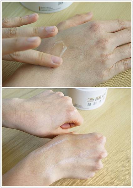 曉丹老師示範酒釀娘凍膜給大家看一下,酒釀娘凍膜塗抹在手上時比較像是半透明乳白狀,有點精華液稠稠的感覺,非常的滋潤,而且延展性很好,味道也不會太嗆鼻,是淡淡的酒釀味,像只是在手上塗抹幾分鐘,就明顯可以感受到手部肌膚變得很滑順跟滋潤,膚色也亮了很多,因為酒釀娘凍膜屬於天然的保養品,所以一點都不會給肌膚造成負擔!