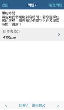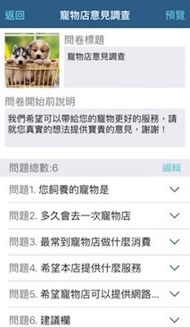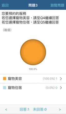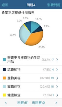 一旦客人回覆問卷,系統馬上會做統計,產生以下的圖表。調查結果顯示,客人最希望我們增加寵物美容跟寵物住宿這兩項服務,但因為我們店的坪數不大,所以如果要增加這些服務,我們就要考慮重新規劃我們的空間。