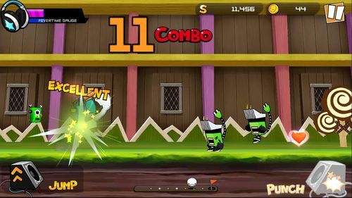遊戲畫面設計的非常合我的胃口,而作為重點的音樂選曲也真的非常棒,是讓人聽了就會想去找整首來聽的等級。而玩家在跑酷的時候敵人會隨著音樂的節拍出現,這時候當然就不要客氣按下Punch打飛它們吧!!