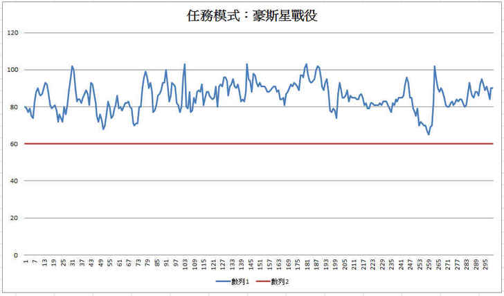 FPS的畫面表示約104.433,同樣也大於基準的FPS60,甚至比豪斯星戰役的流暢度還要來的好許多。