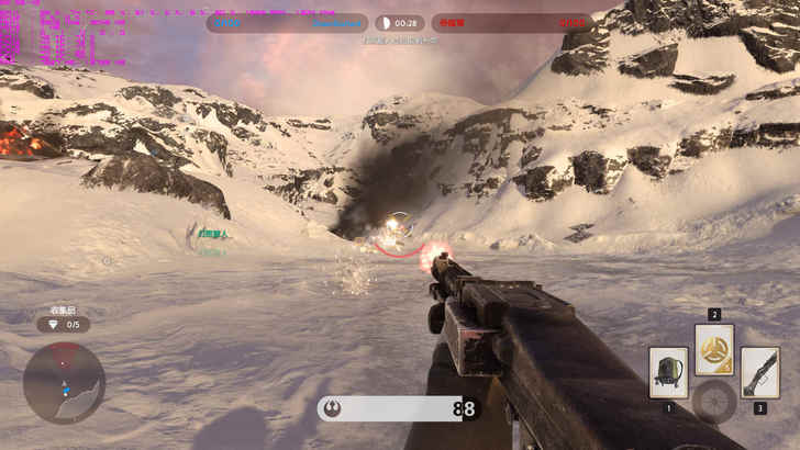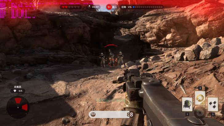 在塔圖因星生存戰中的地形變化又比豪斯星戰役的地圖複雜許多,因此在移動中要注意腳邊的位置,一不小心可能就會摔落老馬了XD,而被帝國兵打到畫面上的視野會呈現紅色,生命值也會下降,但只要連續10秒沒被打到就會回血回滿了,只是在生存戰中真的有點困難就是了,因為帝國兵真的太多啦。