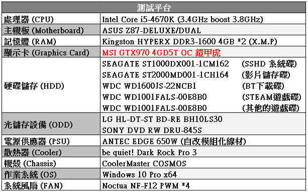 電腦配備上上有做一些小異動,原先是DDR3-1866 8GB*2,更換成DDR3-1600 4GB*2,然後汰換掉原本一個1TB硬碟XD,其餘的配備就是跟之前的測試平台一樣,全部都沒有經過超頻,全部都是預設時脈。