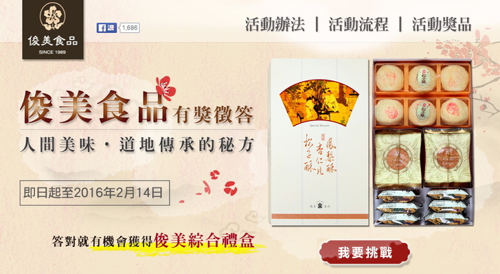 正在找過年伴手禮,打算訂俊美松子酥回家跟家人分享,但意外地發現俊美現在在抽禮盒耶~~ 剛剛看到活動至2016/02/14喔~~~ 大家可以來試試手氣唷~~ http://2016year.food168.com.tw/ 讚 收藏 快速回應 引言回應