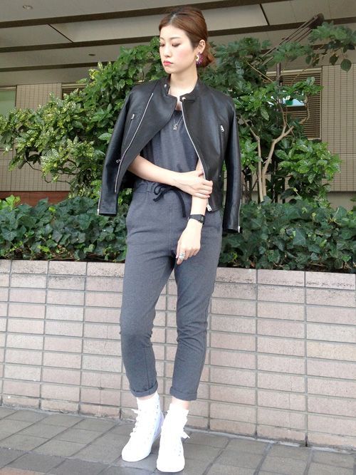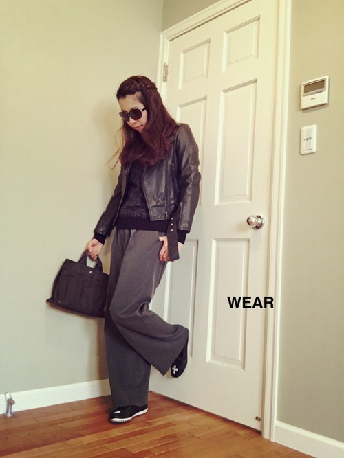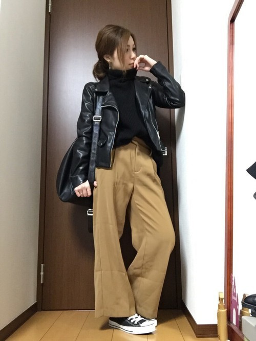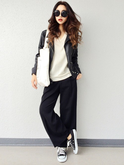 騎士外套+寬褲維持上身窄下身寬的原則,搭上黑色寬褲是一種街頭休閒風,如果再把上衣扎進褲子裡腿部線條就會再拉長。