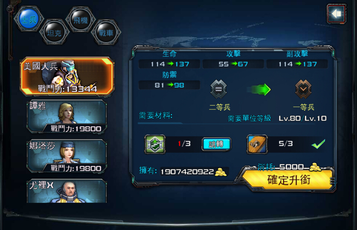 提升軍銜的同時,也提升對應單位的屬性(生命、攻擊、防禦/副攻擊)。