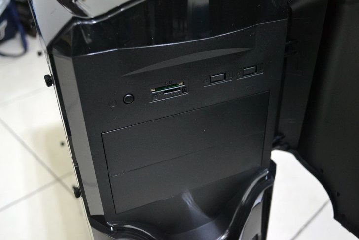 ↑將前方面板打開,可以看到有設計一組記憶卡讀卡機,Reset鈕也放在這裡。前置5.25吋的設備總共可以安裝兩組。在現在許多人組電腦連光碟機都沒有納入清單的情況下,前置5.25吋的槽位其實已經越來越少用到了。