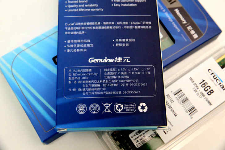 包裝背面上有標示出製造商與台灣代理商 Genuine 捷元的相關資訊,且為終身保固,若未來有需要進行RMA服務時,可以全台灣各地區的捷元據點聯繫,因為產品有問題送原購買店家,購買店家也是轉至代理商,直接找代理商可以少掉這層程序,因此在處理速度上會快上不少。