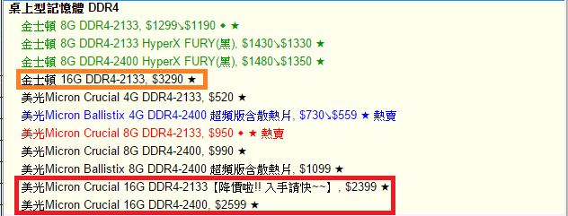 看完相關的性能數據後,在價格上也要來關注一下,以現階段DDR4-2400 8GB已經不到$1000,Micron Crucial的訂價算是市場上算是非常有性價比,以DDR4-2133 16GB來看目前在台灣通路比較常見的品牌規格來看,Micron Cucial也比金士頓便宜將近快一千元,若再排除品牌對照一下本次測試的DDR4-2400 16GB來看,Micron Cucial 幾乎可以說是屌打其他品牌,這也是為什麼本次測試分享文的標題會這樣子下的原因XD。