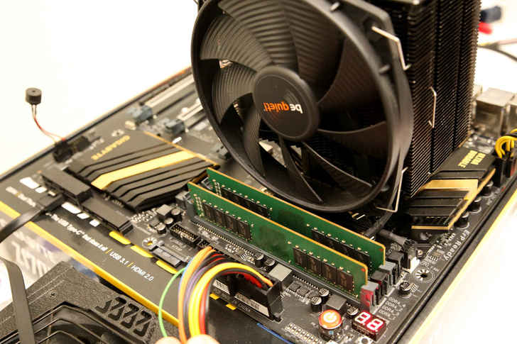 在安裝上PCB板的高度為標準大小,絕大部分的12公分塔型散熱器是不會干涉到,但若有安裝到14公分的塔型散熱器可能就要注意一下,圖中是使用的塔型散熱器是搭載14cm公分的風扇,可能會犧牲到最內側的DIMM擴充。 (CPU散熱器為be quiet! DRAK ROCK 3)