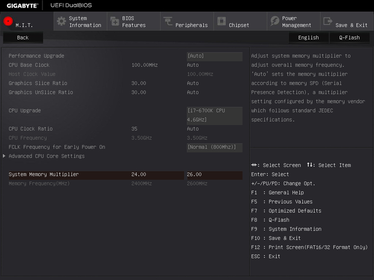 在前面的數據皆是以預設時脈來測,但如果就這樣子結束就有點太對不起Z170平台了,於是就使用BIOS內建的 CPU Upgrade 將時脈提升至4.6GHz,此外也手動將記憶體的時脈提升至2600MHz,來看看其效能能提升多少。