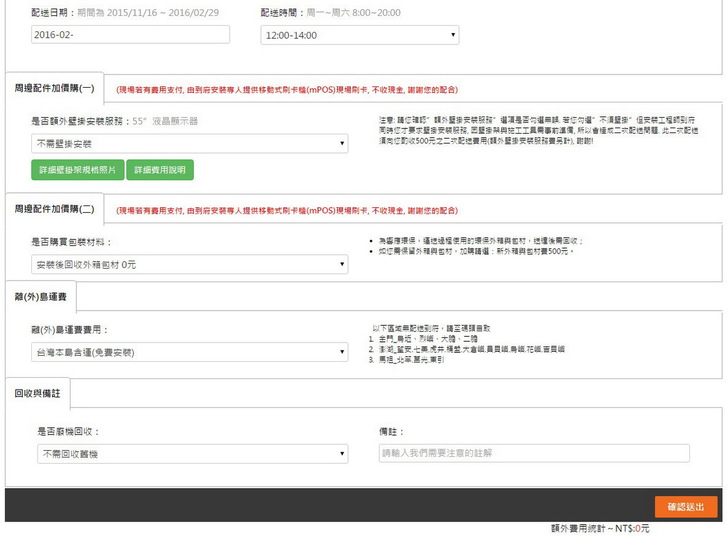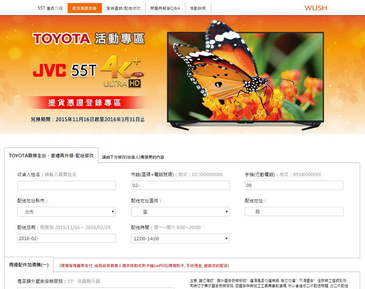 上網輸入序號和流水號登入,登記個人資訊和地址、配送日期,但因為太熱門了所以都要等一兩個星期以上,另外還要選包材回收(不選回收要留的話要500)、安裝壁掛(加錢,原廠壁掛架+施工3000,只要掛架的話1000)