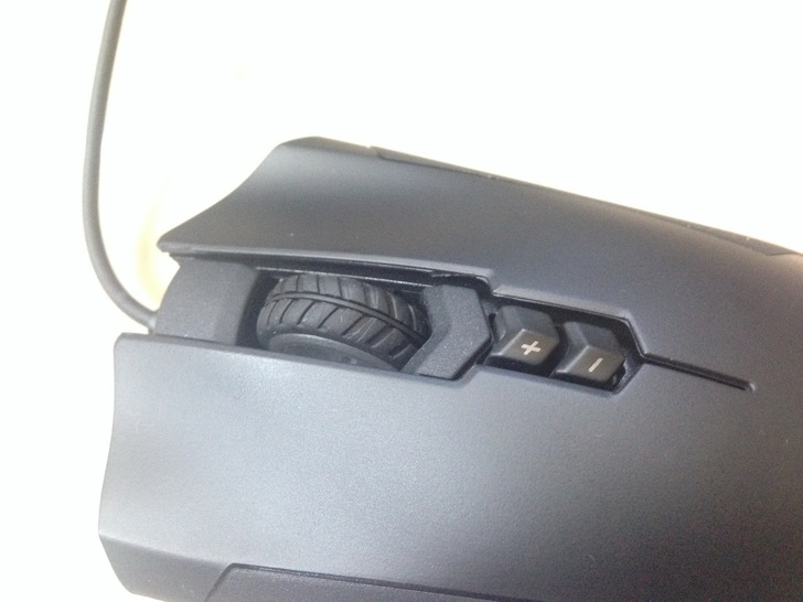 滑鼠中間的滾輪兼中鍵,以輪胎外形的橡膠設計增加手感與摩擦力,使用上的觸感與準度不錯!下方的+-鍵則是讓你即時切換DPI的,預設為800、1600、2400、3200