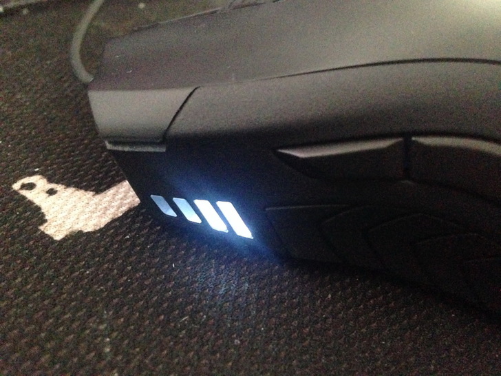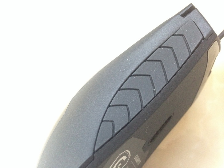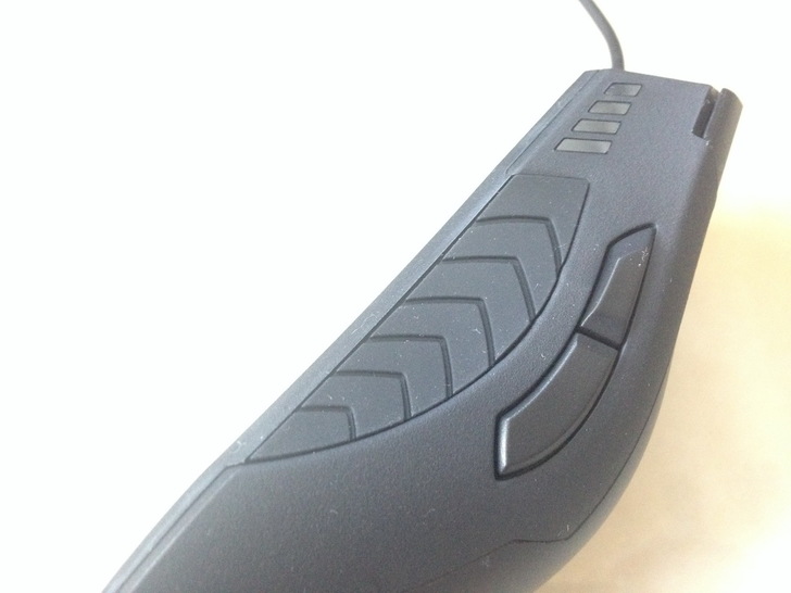 XM300的左則,有著防滑的橡膠,前方的四個燈是顯示目前DPI檔位,位於大姆指那的兩個按鍵預設是上一頁和下一頁,瀏覽網頁和找檔案時還滿好用的