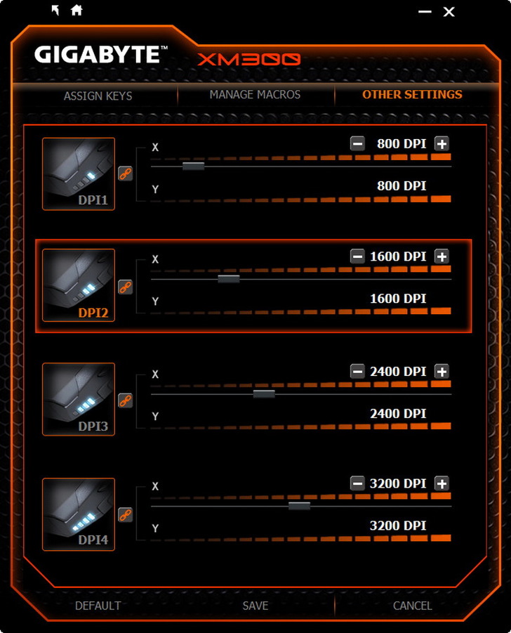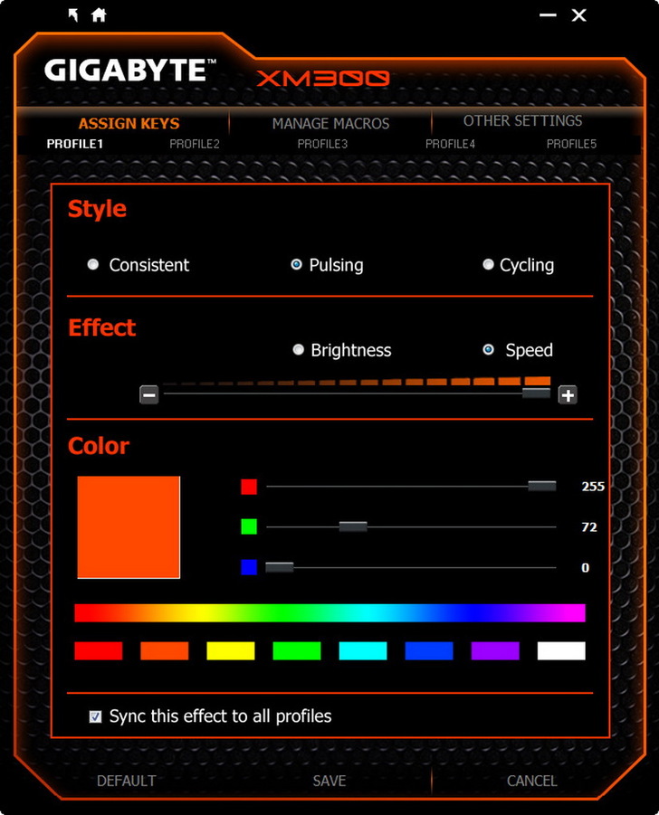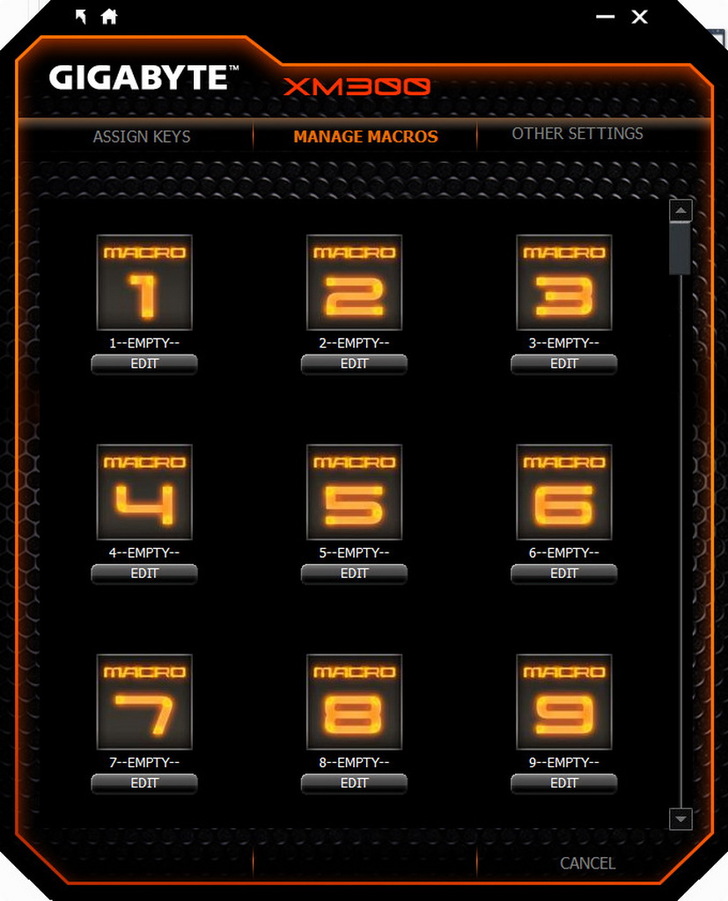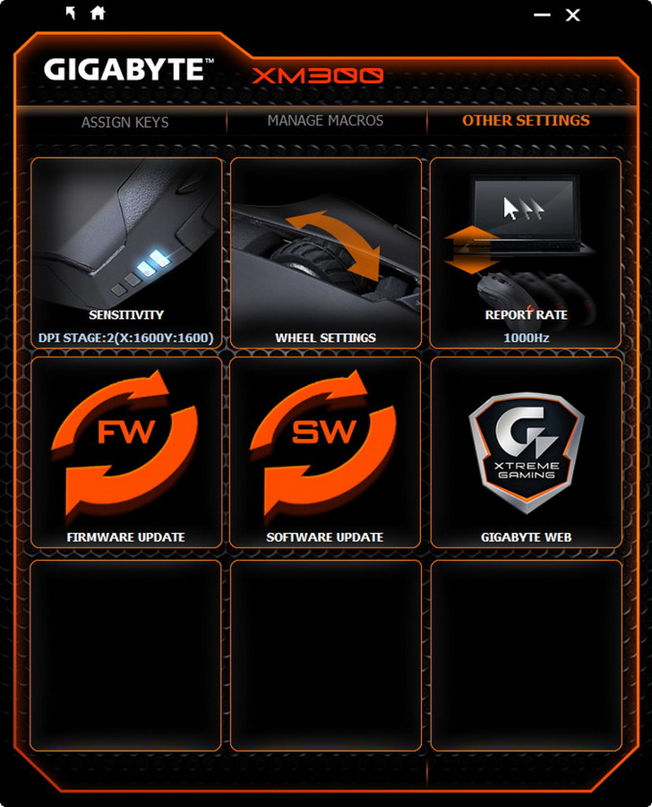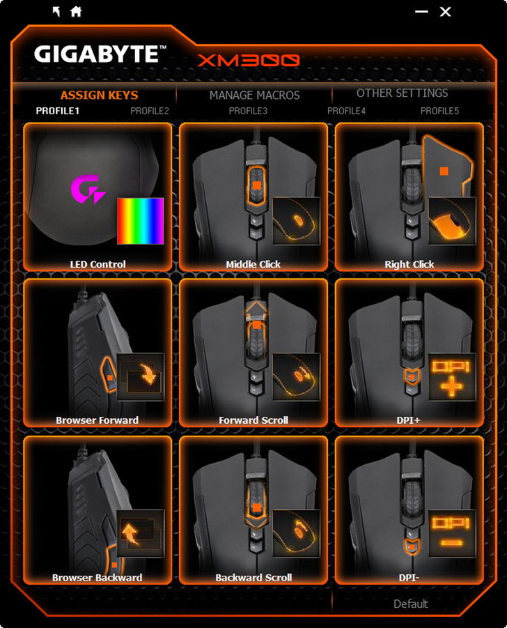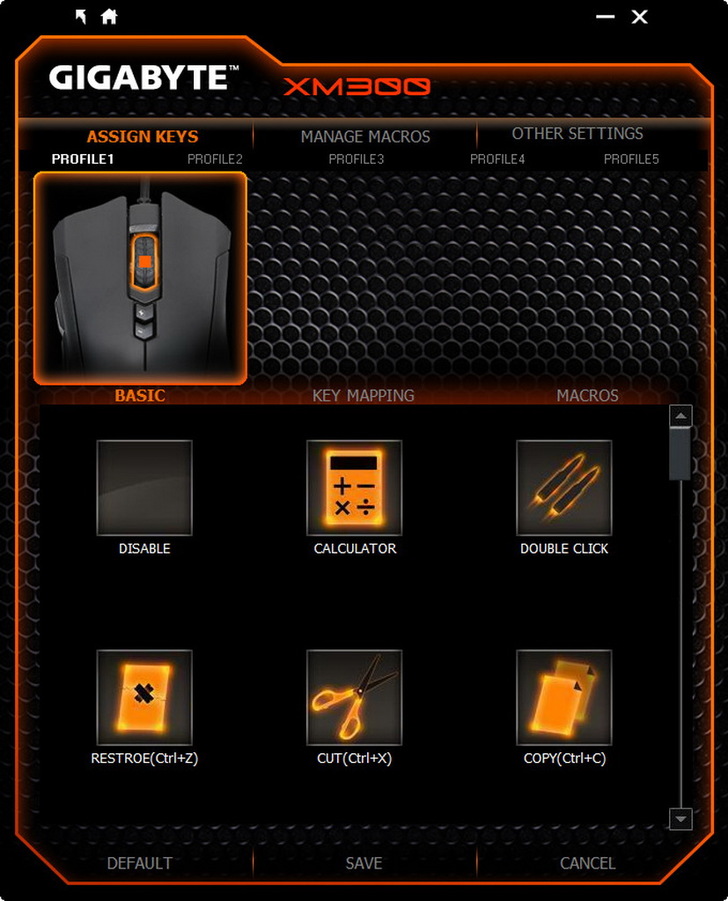 XM300專屬的軟體介面,可說是這支滑鼠的靈魂,在這裡面可設定調整的項目非常多!第一個分頁的ASSIGN KEYS可另外儲存5組設定檔,9宮格的設計可以快速的讓你設定按鍵各個功能,除了滑鼠發光的顏色可以改變,滑鼠的任何按鍵都可以指定或換成巨集功能,例如把滑鼠右鍵換成滾輪向上,把滾輪向前換成多媒體播放的快轉,或是Ctrl+C、滾輪向後換成Ctrl+V,這樣在做大量文件整理時,只要移動滑鼠指標,然後上下滾動滾輪就好了,不然就是指定成巨集按鍵,這樣的組合功能賦予這支XM300強大的實用性!